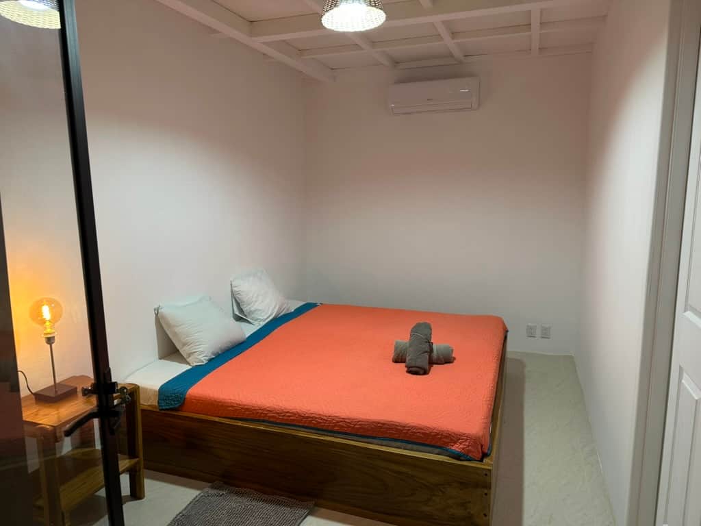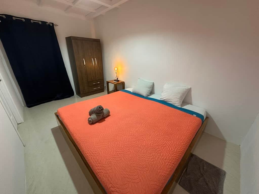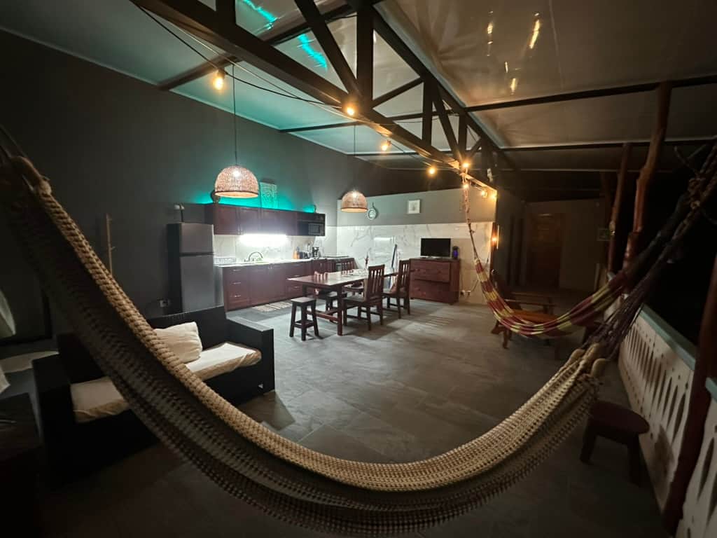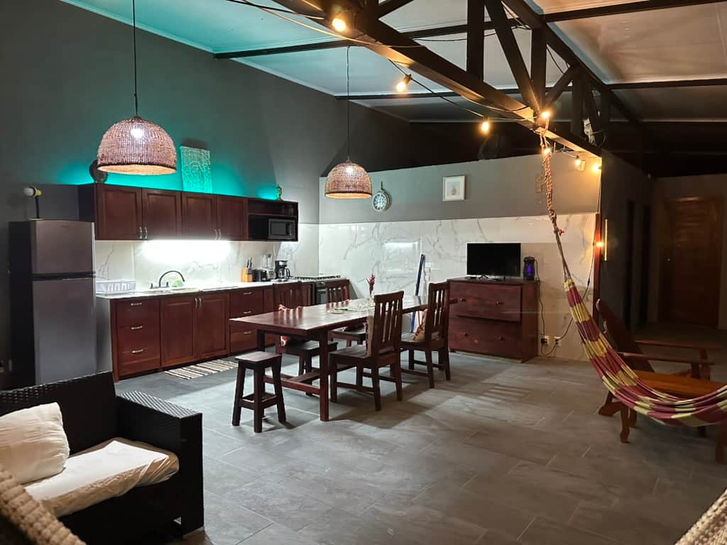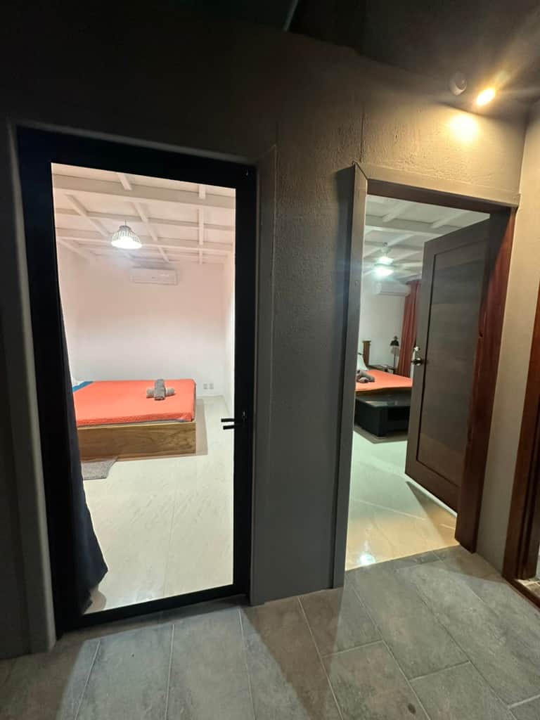 Apartamento tipo casa del árbol de 2 habitaciones, con aire acondicionado en ambas, internet wifi de fibra óptica, 1 baño con agua caliente, Smart TV, cocina con estufa grande, refrigerador, microondas y utensilios básicos de cocina. 1 cama king size (hecho con 2 colchones individuales) en cada habitación.